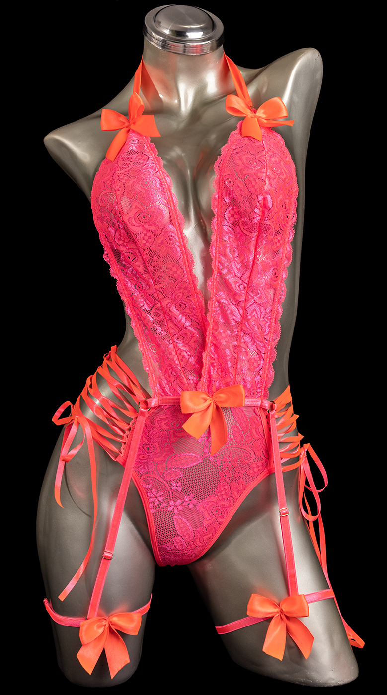 Body color salmón neón neón elaborado en encaje con herrajes plateados y tiras corredizas