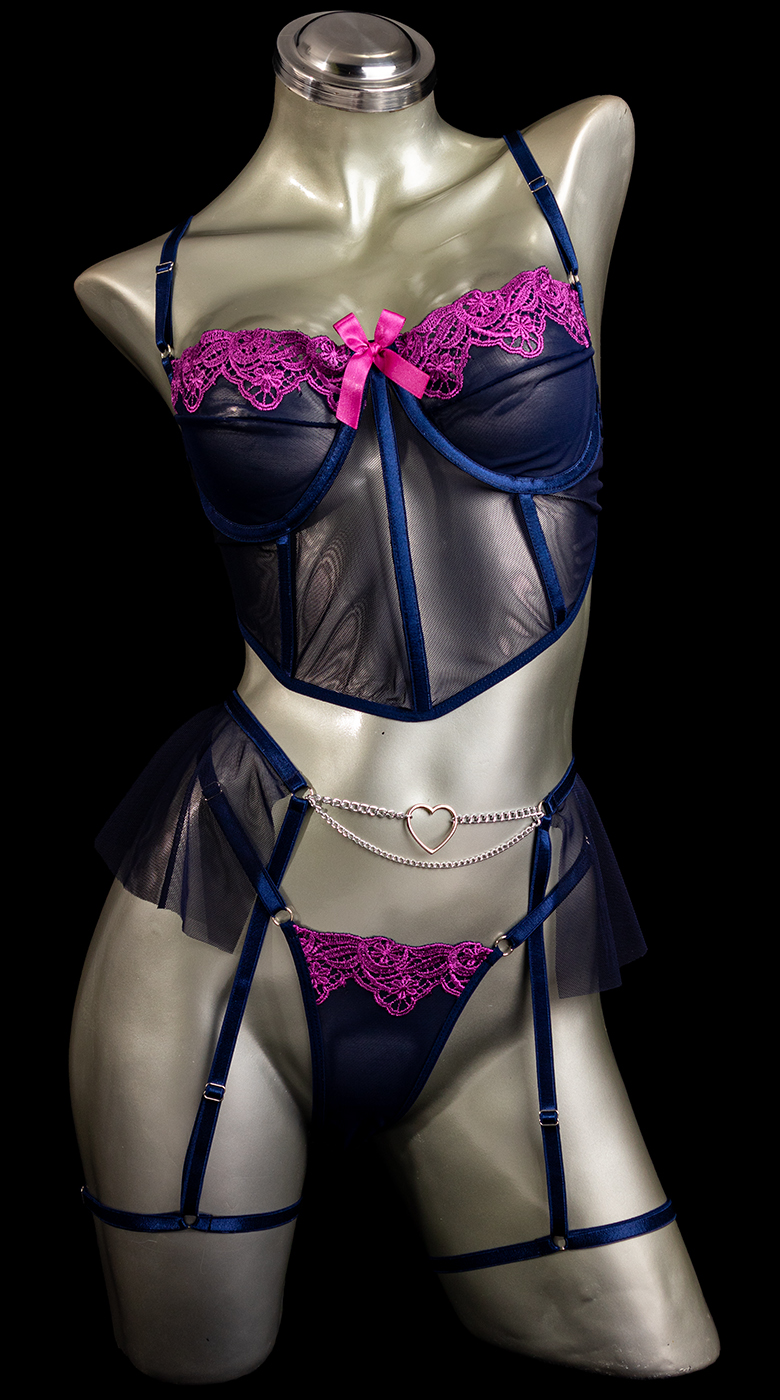 Conjunto liguero color azul oscuro elaborado en mallatex con copa varilla talla 34/36, herrajes plateados y tiras corredizas