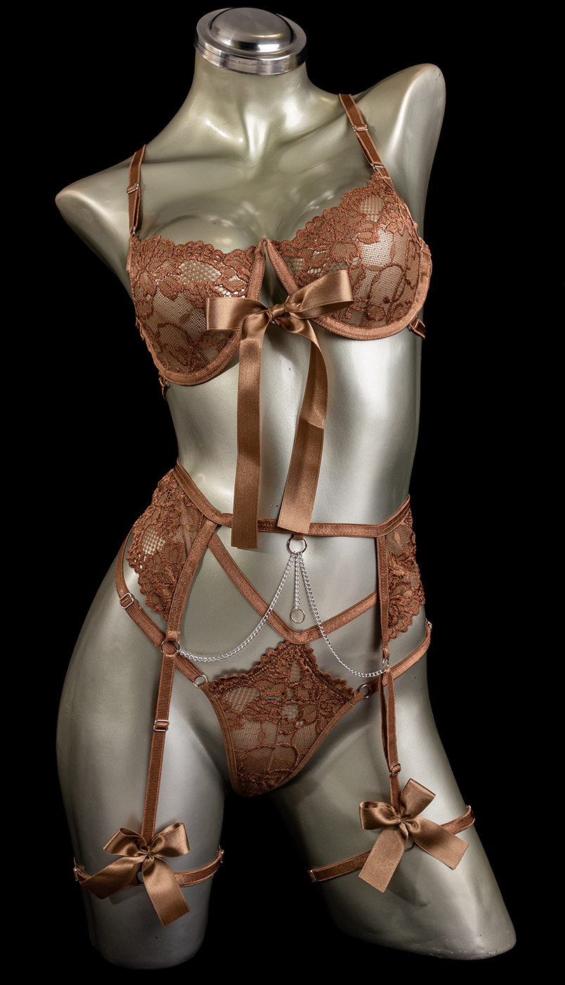 Conjunto liguero color café elaborado en encaje con copa varilla talla 34/36, herrajes plateados y tiras corredizas