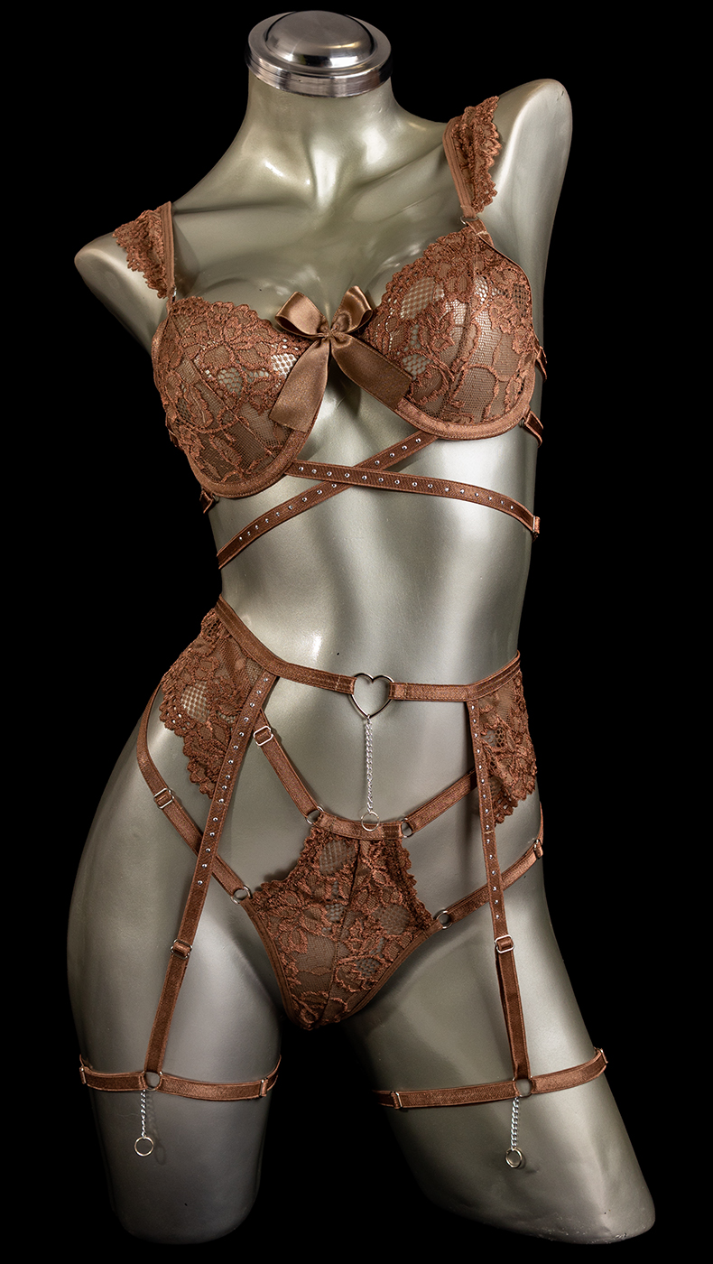 Conjunto liguero color café elaborado en encaje con copa varilla talla 34/36, herrajes plateados y tiras corredizas