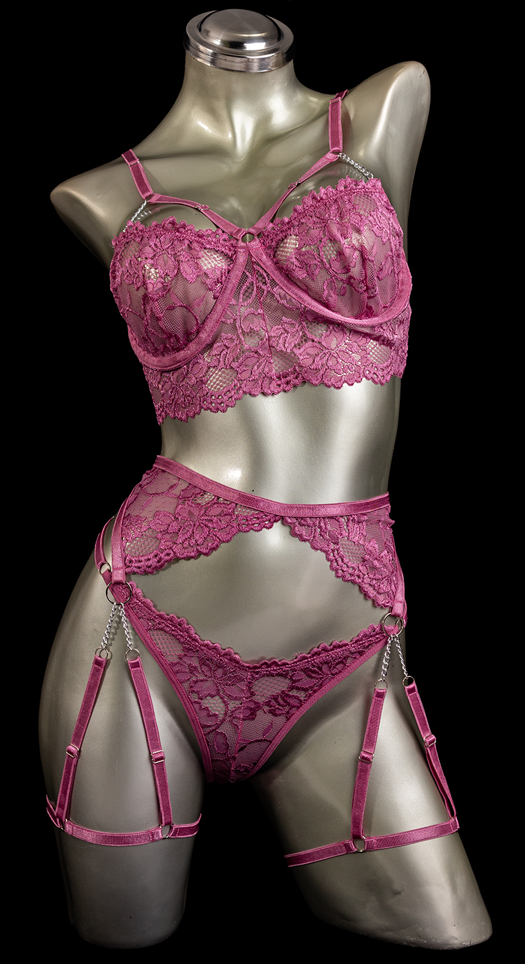 Conjunto liguero color rosa oscuro elaborado en encaje con copa varilla talla 34/36, herrajes plateados y tiras corredizas