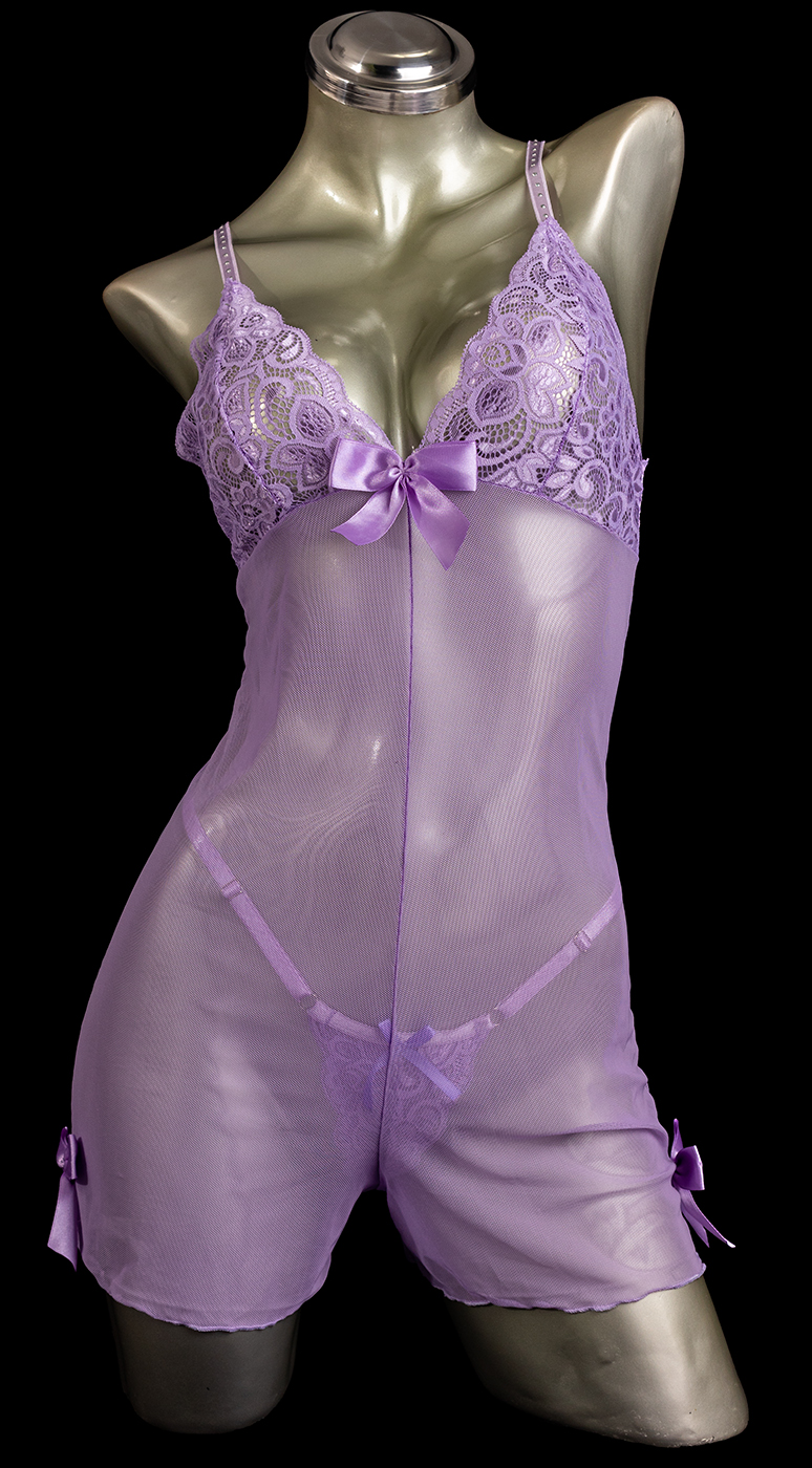 Pijama color lila elaborado en encaje y mallatex con herrajes plateados y tiras corredizas
